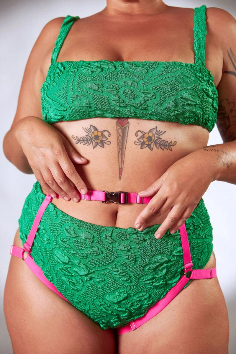 What’s not to love about this bottom harness? Neon pink elastic and silver hardware, the harness is adjustable to fit all bodies.