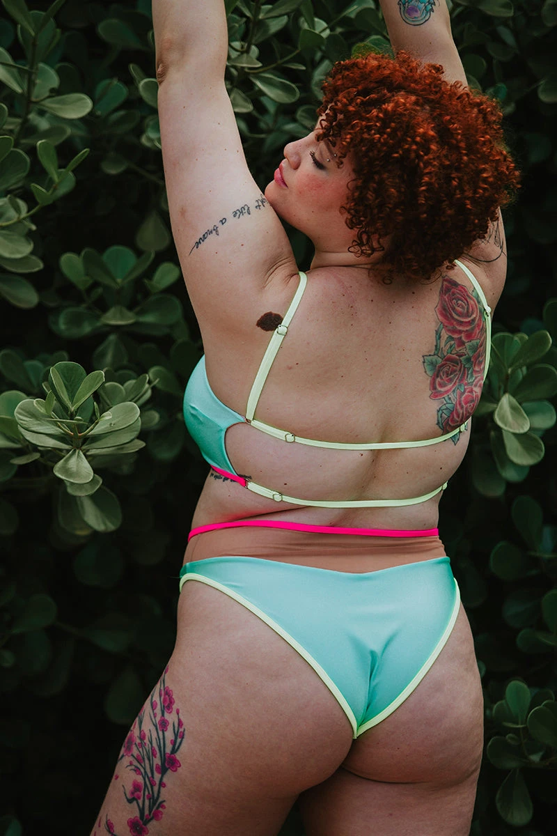 This shimmery Neon set is out of this world. This scoop neck top can be worn blue or Rosé so you can change up our look. We love the neon piping details and strappy back.
